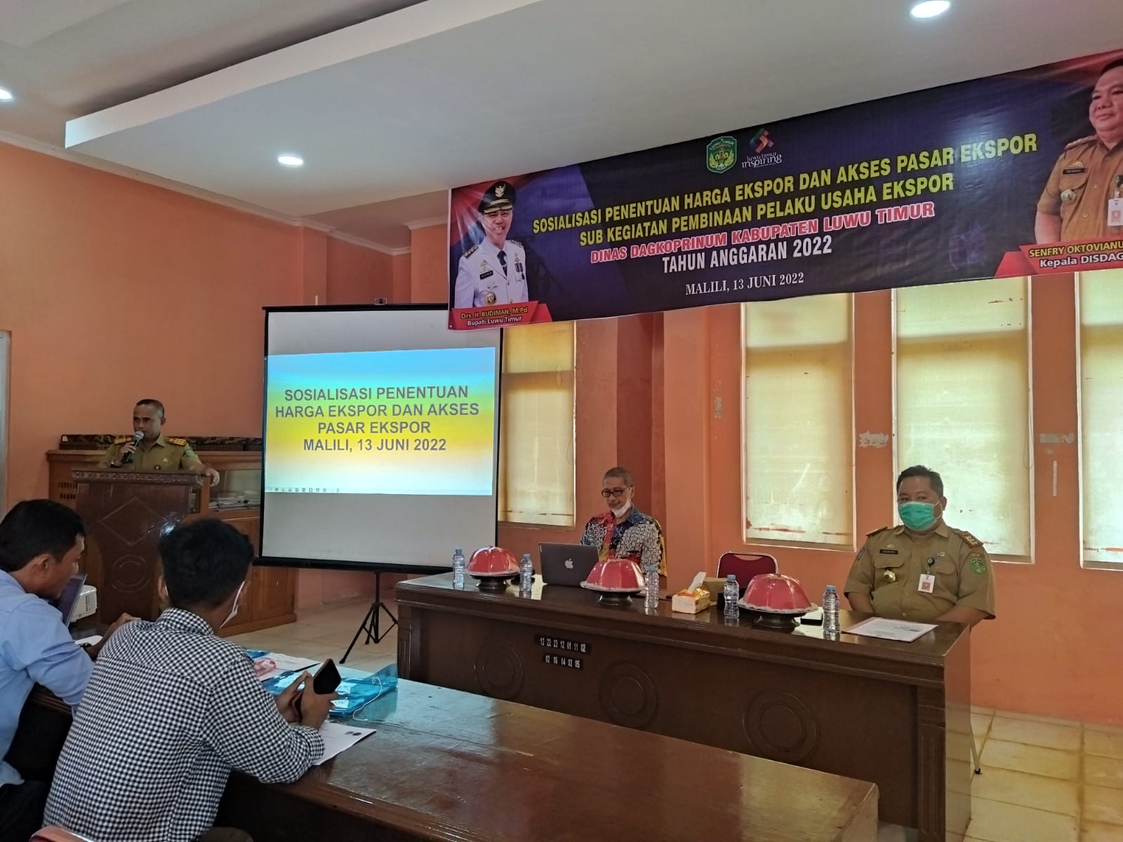Lutim,warta.luwutimurkab.go.id- Pemerintah Kabupaten Luwu Timur melalui Dinas Perdagangan, Koperasi Perindustrian dan UKM (Disdagkoprinum) menggelar Sosialisasi Penentuan Harga Ekspor dan Akses Pasar Ekspor Tahun Anggaran 2022 bertempat di Aula Kantor Dinas Dagkoprinum Kab. Luwu Timur, Senin (13/06/2022).