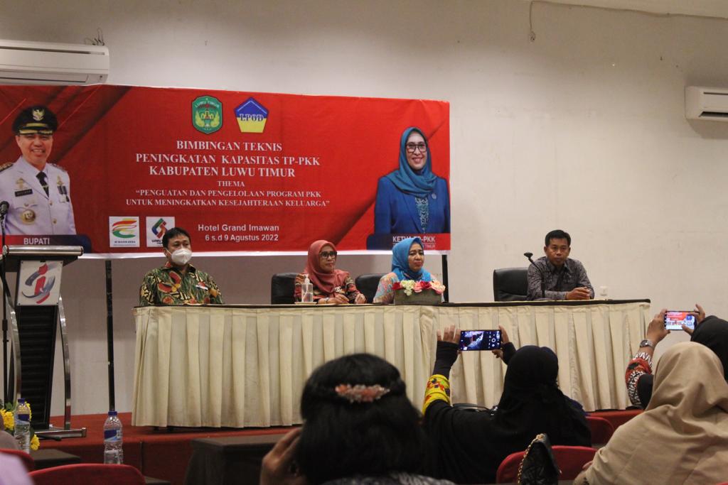 Ketua TP-PKK Luwu Timur, Hj. Sufriaty menyampaikan bahwa, bapak Bupati dan pemerintah sangat memperhatikan PKK sehingga dikeluarkan anggaran yang cukup besar untuk memberikan bimtek ini dan juga studi banding ke Bali guna meningkatkan kapasitas dan wawasan kita untuk mengelola PKK desa masing-masing sebagai pendorong kemajuan Kabupaten Luwu Timur yang lebih maju dan berkelanjutan.