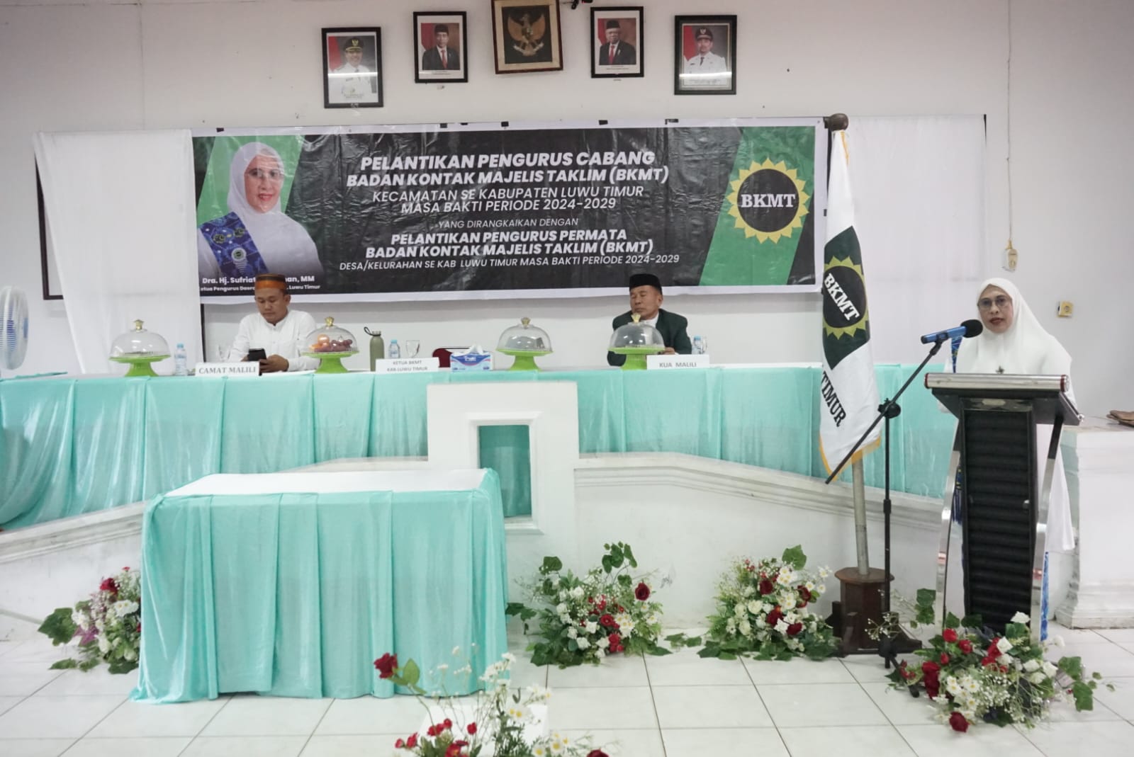 Lutim,warta.luwutimurkab.go.id- Ketua Pengurus Daerah Badan Kontak Majelis Taqlim (BKMT) Kabupaten Luwu Timur, Hj. Sufriaty Budiman sekaligus Ketua TP PKK melantik Pengurus Cabang BKMT Kecamatan Malili yang dirangkaikan dengan pelantikan Pengurus Permata (PP) BKMT Desa se-Kecamatan Malili, di Aula Kantor Camat Malili, Jum’at (07/06/2024).