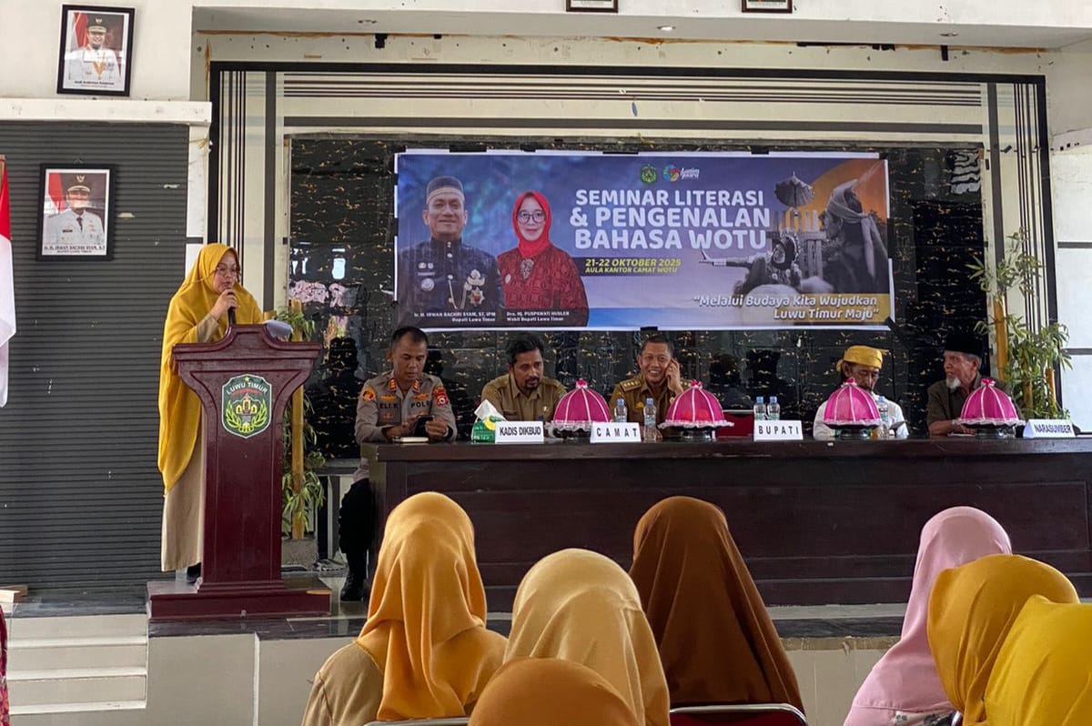 Lutim, warta.luwutimurkab.go.id- Pemerintah Kabupaten Luwu Timur melalui Dinas Pendidikan dan Kebudayaan menggelar Seminar Literasi dan Sosialisasi Bahasa Wotu yang berlangsung di Aula Kantor Camat Wotu, Selasa (21/10/2025).