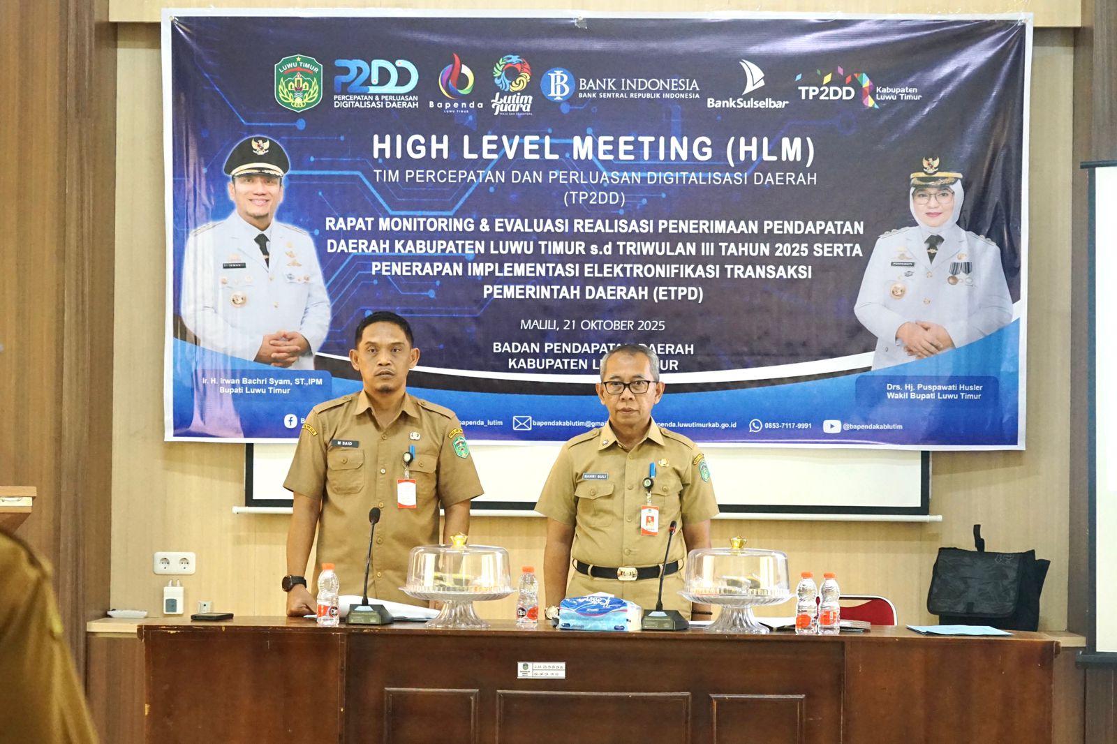 Lutim, warta.luwutimurkab.go.id- Guna memperkuat tata kelola keuangan daerah yang transparan, akuntabel, dan berbasis digital, Pemerintah Kabupaten Luwu Timur melalui Badan Pendapatan Daerah (Bapenda) menggelar High Level Meeting (HLM) Tim Percepatan dan Perluasan Digitalisasi Daerah (TP2DD).