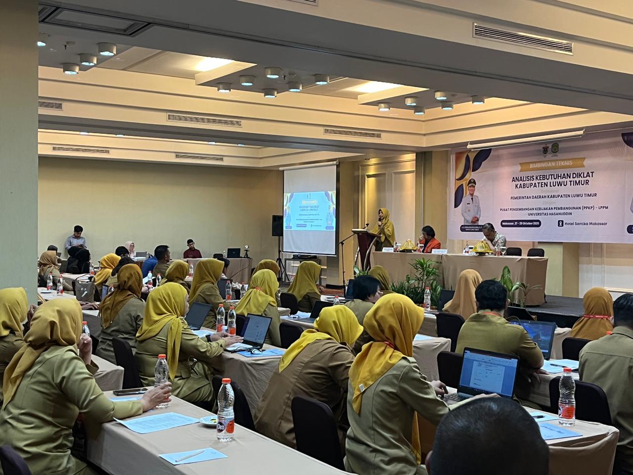 Lutim, warta.luwutimurkab.go.id- Pemerintah Kabupaten Luwu Timur bekerjasama dengan Pusat Pengembangan Kebijakan Pembangunan Lembaga Penelitian (PPKP) dan Pengabdian kepada Masyarakat (LPPM) Universitas Hasanuddin (Unhas) menggelar Bimtek Analisis Kebutuhan Pendidikan dan Pelatihan (Diklat) Tahun 2025 yang berlangsung di Aula Hotel Santika, Makassar, Senin (27/10/2025).