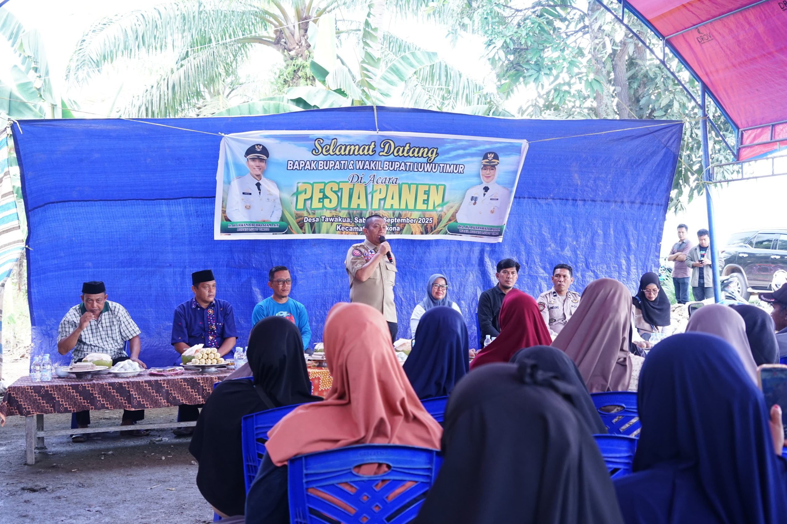 Lutim, warta.luwutimurkab.go.id-  Bupati Luwu Timur, Irwan Bachri Syam menghadiri acara Pesta Panen di Desa Tawakua, Kecamatan Angkona, Sabtu (08/11/2025).