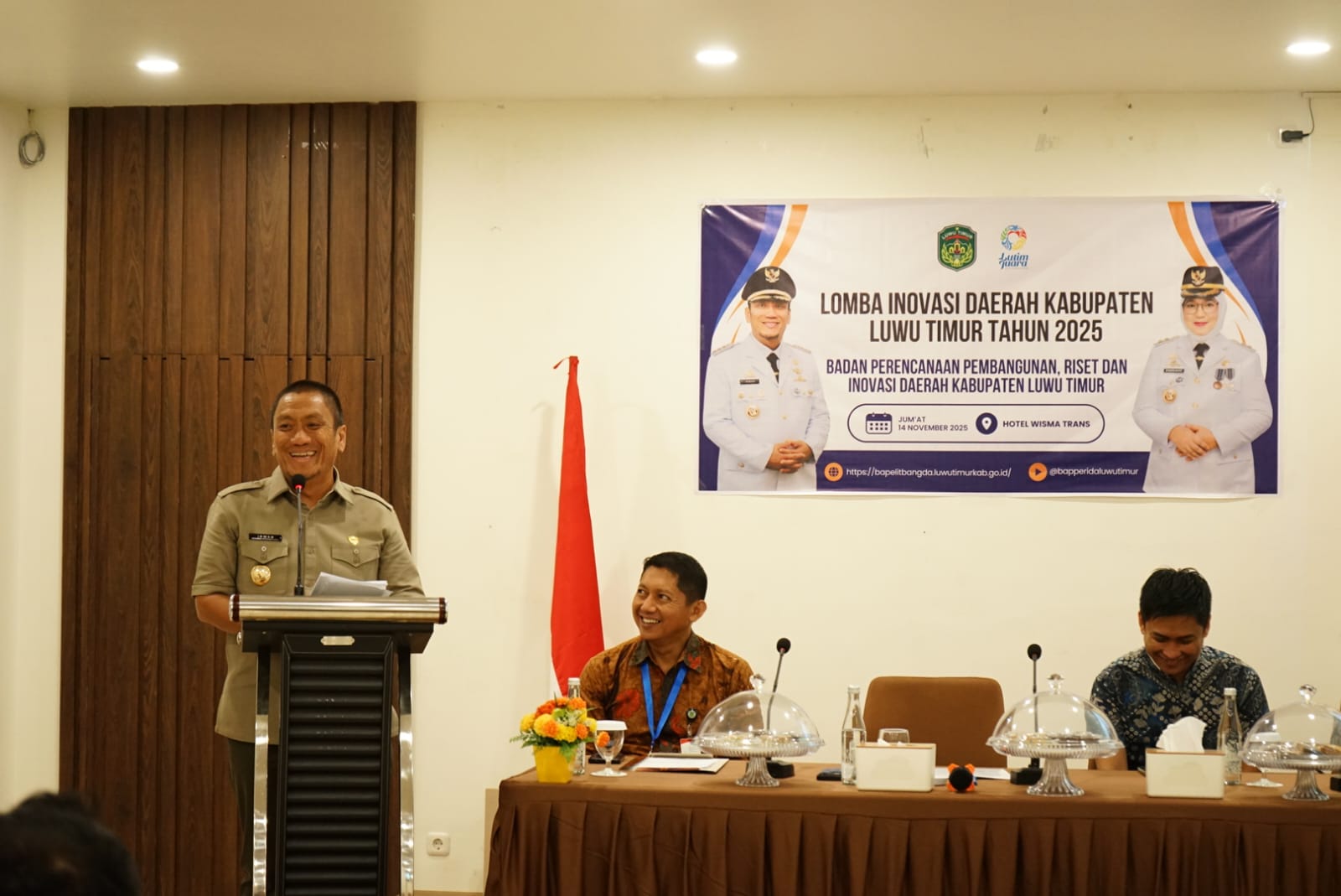 Lutim, warta.luwutimurkab.go.id- Bupati Luwu Timur, Irwan Bachri Syam, menghadiri sekaligus ikut terlibat sebagai penilai pada Lomba Inovasi Daerah Kabupaten Luwu Timur Tahun 2025 yang digelar oleh Badan Perencanaan Pembangunan, Riset dan Inovasi Daerah (Bapperida) Lutim, di Wisma Trans Malili, Jum’at (14/11/2025).