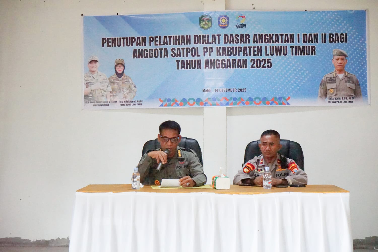 Lutim,warta.luwutimurkab.go.id- Plt. Kepala Satuan Polisi Pamong Praja, Baharuddin, S.Pd.,M.Si mewakili Bupati Luwu Timur secara resmi menutup kegiatan Pendidikan Dasar (Diksar) Satuan Polisi Pamong Praja (Satpol PP) Lutim, Ahad (14/12/2025), yang berlangsung di Hotel Sikumbang, Kecamatan Tomoni.