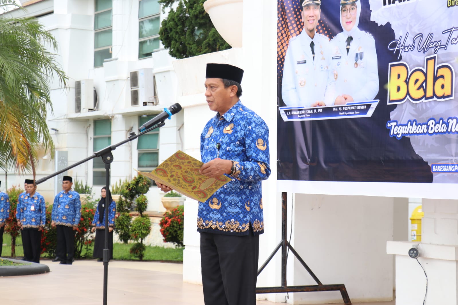 Lutim,warta.luwutimurkab.go.id- Pj. Sekretaris Daerah Luwu Timur, Dr. Ramadhan Pirade, memimpin Upacara Peringatan Hari Kesadaran Nasional (HKN) yang dirangkaikan dengan Hari Bela Negara (HBN) ke-77 Tahun 2025, di halaman Kantor Bupati, Rabu (17/12/2025).