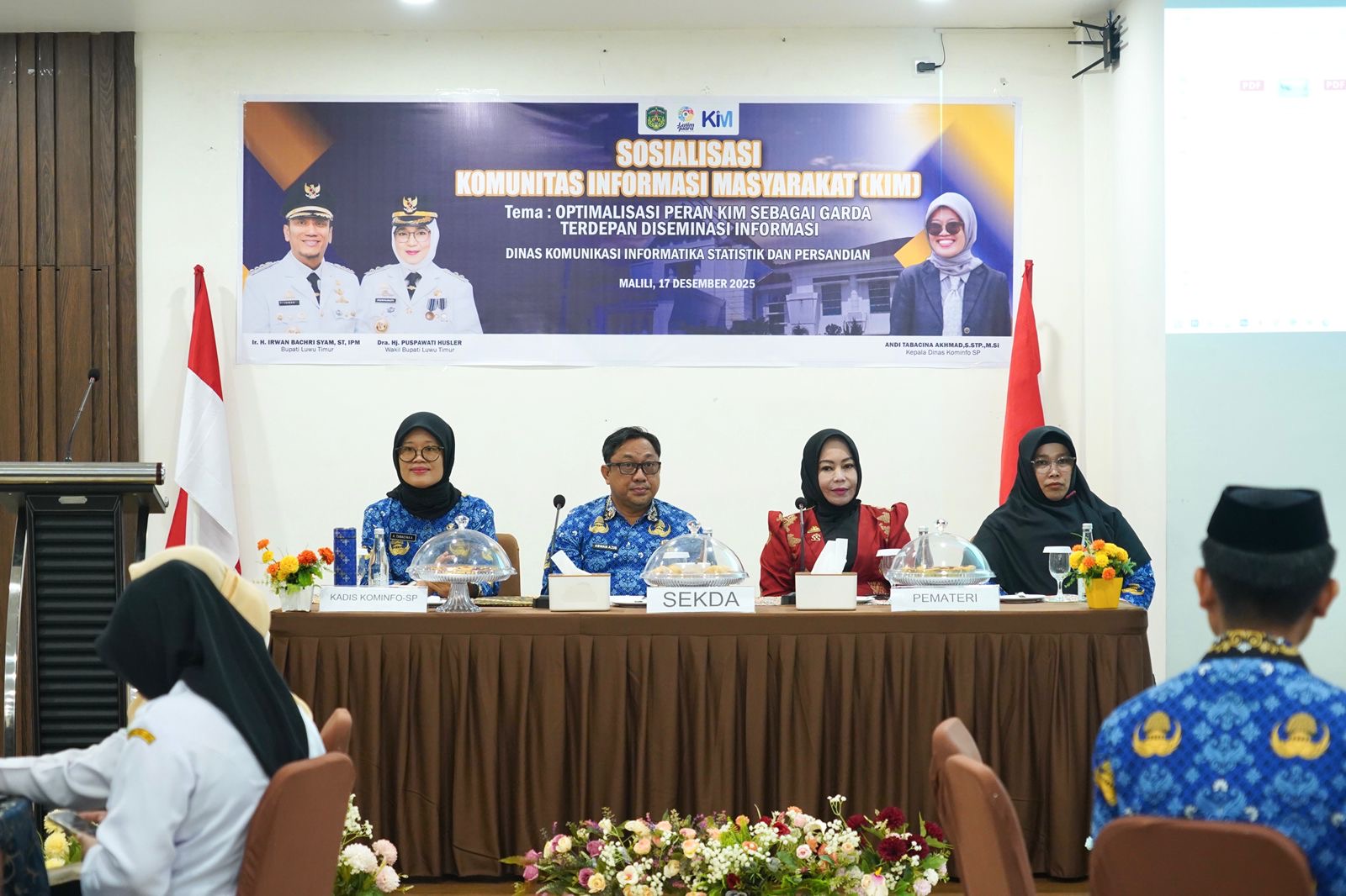 Lutim,warta.luwutimurkab.go.id- Pemerintah Kabupaten Luwu Timur melalui Dinas Komunikasi, Informatika, Statistik dan Persandian (Diskominfo-SP) menggelar Sosialisasi Komunitas Informasi Masyarakat (KIM) dengan tema “Optimalisasi Peran KIM sebagai Garda Terdepan Diseminasi Informasi”, yang dilaksanakan di Aula Wisma Trans, Rabu (17/12/2025).