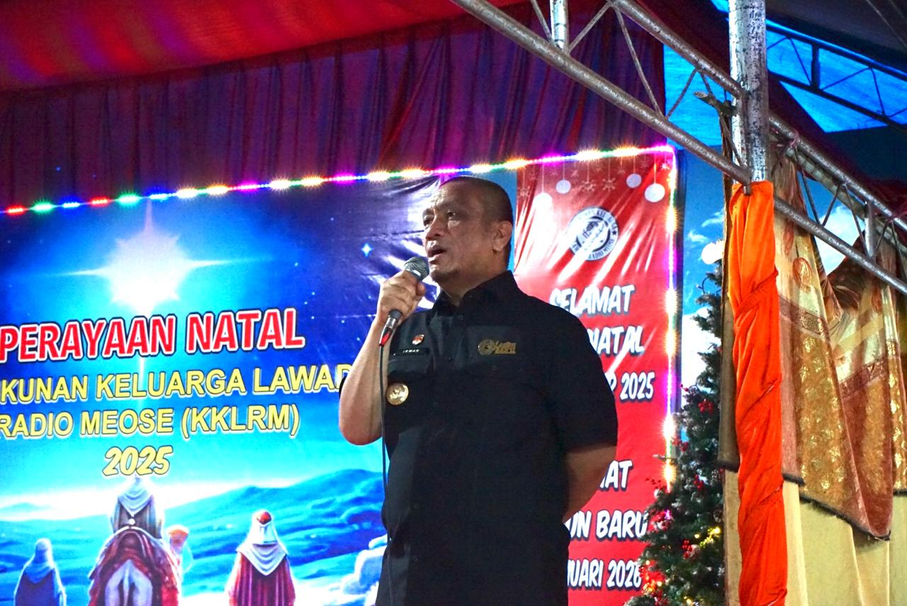 Lutim, warta.luwutimurkab.go.id- Bupati Luwu Timur, Irwan Bachri Syam, menghadiri Perayaan Natal Kerukunan Keluarga Lawado Radio Meose (KKLRM) yang digelar di Desa Tampinna, Kecamatan Angkona, Jumat (26/12/2025).