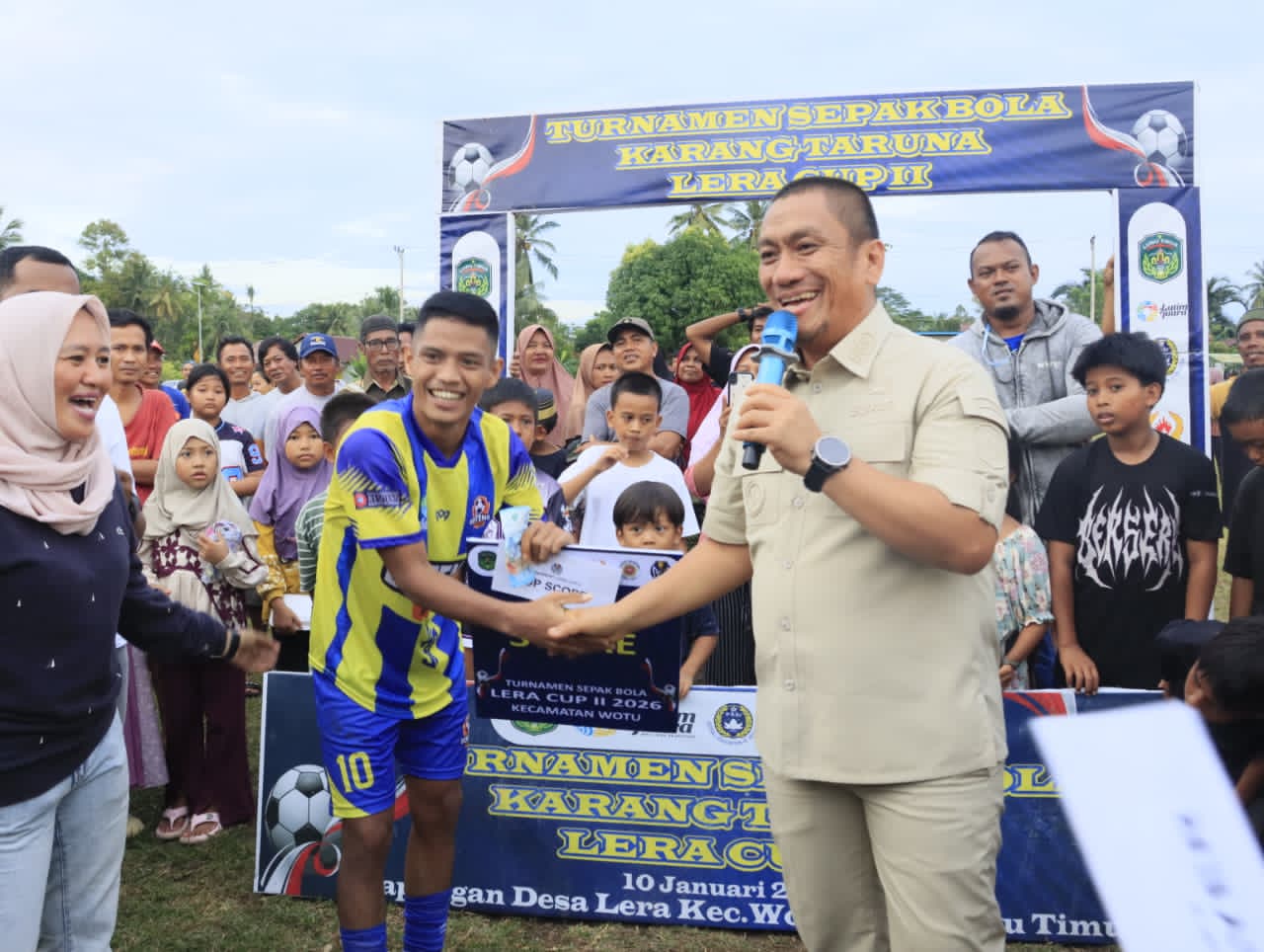 Lutim, warta.luwutimurkab.go.id – Turnamen Sepak Bola Karang Taruna Lera Cup II resmi berakhir, Sabtu (31/01/2026). Bupati Luwu Timur, Irwan Bachri Syam, hadir langsung menutup kompetisi tersebut sekaligus menyaksikan laga final yang mempertemukan antara Lera United melawan Benteng Utama di Lapangan Desa Lera, Kecamatan Wotu.