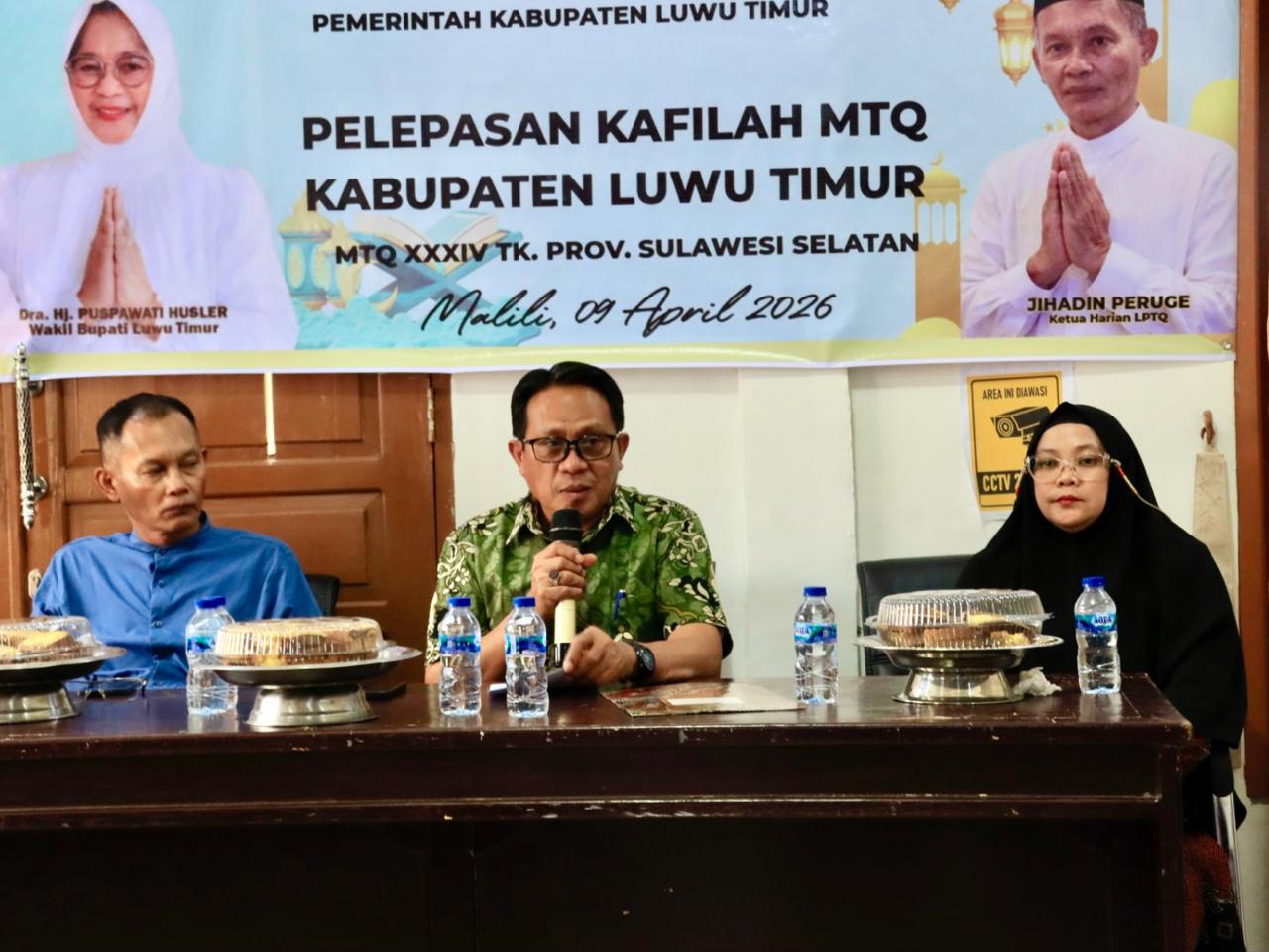 Lutim, warta.luwutimurkab.go.id – Sekretaris Daerah Kabupaten Luwu Timur, Ramadhan Pirade, memberikan pengarahan sekaligus secara resmi melepas kafilah Musabaqah Tilawatil Qur’an (MTQ) Kabupaten Luwu Timur yang akan berlaga pada ajang Musabaqah Tilawatil Qur’an XXXIV Tingkat Provinsi Sulawesi Selatan di Kabupaten Maros. Kegiatan pelepasan bertempat di Rumah Jabatan Wakil Ketua DPRD Luwu Timur, Kamis (9/4/2026).
